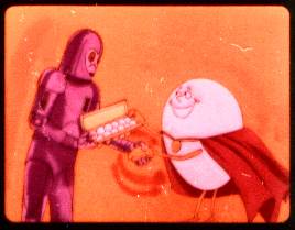 The three-egg salute is executed by Sarah, Matthew, and "Rodney, the proper, well-organized robot." "But wait," you say, "Isn't that gold robot just a really obvious ripoff of C3PO?" No, no, no! Rodney is only gold on the cover to the book! Here's what he looks like in the filmstrip (remember filmstrips?):
